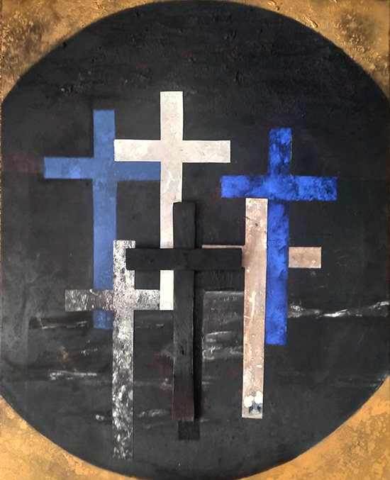 El significado de esta obra está inspirado en el capítulo de la vida de Jesús en el Huerto de Getsemaní donde, solo y sabiendo que será crucificado, su voz interior lo lleva de la rebelión inicial a la comprensión y de la individualidad al colectivo. Y esa cruz de madera quemada con los agujeros donde se sujetaba, que aparece en el cuadro como un collage, provoca un eco detrás de cruces luminosas.